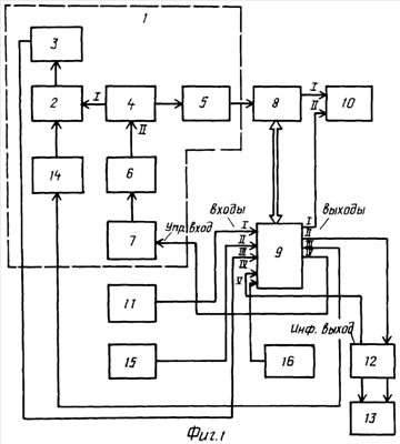 Антенна 2 БРЛС 1 через первый вход антенного переключателя 4, приемник 5 и процессор сигналов 8 соединена с процессором управления прицеливанием 9 посредством линии связи. Вход индикатора 10 соединен с первым выходом процессора управления прицеливанием 9, второй выход которого подключен ко входу блока связи с ракетами 12, третий – ко входу блока управления антенной 14, а четвертый – к управляющему входу синхронизатора 7. Входы процессора 9 соответственно соединены: первый вход – с переключателем режимов атаки 11, второй вход – с переключателем смещения зоны обзора 15, третий вход – с датчиками угла поворота и угловой скорости зеркала антенны 3, четвертый вход – с информационным выходом блока связи с ракетами 12, а пятый вход – с выходами датчиков высоты и крена самолета 16. Выходы блока связи с ракетами 12 подключены ко входам ракет 13.