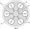 Каркас 10 представляет монолитную конструкцию с гнездами 36 для крепления КЗ и образованными в ней каналами 40 для размещения детонирующих шнуров 30, закрытых при необходимости пробками 41. При этом шнуры 30 могут находиться в канале 40 как полностью, так и частично (фиг.3), в зависимости от реализуемого запаздывания при подрыве периферийных зарядов 14 по отношению к центральному 12, определяемого длиной шнуров 30.
