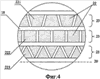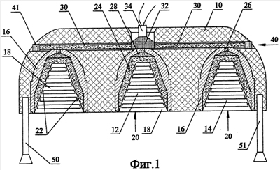 На фиг.4 укрупненно показана форма рельефного тиснения 22 облицовки 18, выполненной из металла, например меди. Тиснение может иметь форму многоугольников (трапеций 221, квадратов 222, треугольников 223 и др. фигур), равномерно расположенных по поясам (окружным слоям) 23, параллельным основанию 20. Форма и размер фигур по смежным поясам 23, а также ширина самих поясов могут варьироваться. В настоящем описании топология упорядоченного рельефного тиснения не описывается и может быть выполнена по одному из известных вариантов. При изготовлении конусной облицовки путем сворачивания сектора необходимо следить, чтобы равномерность рельефа соблюдалась по каждому окружному слою – поясу 23.