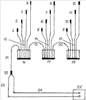 Предлагаемый способ поясняется чертежом, на котором показана схема соединения средств взрывания. Цифрами 1, 2, 3 10, 11, 12 обозначены зажигательные трубки, при этом зажигательные трубки минимальной длины – 1, 5, 9, максимальной длины – 4, 8, 12, пучки зажигательных трубок – 13, 14, 15, зажигательные патроны – 16, 17, 18, отрезки огнепроводного шнура, соединяющие зажигательные патроны в направлении инициирования шпуровых зарядов, – 19, 20, отрезок огнепроводного шнура электровоспламенительной трубки – 21, электрозажигатель – 22, электрические провода электровоспламенительной трубки – 23, электрические провода электровзрывной сети – 24, источник электрического тока – 25.