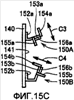 На фиг.14 показан вид, представляющий внутреннюю структуру шагомера в соответствии с третьим вариантом воплощения, и представляет собой схематичное изображение в виде сбоку, когда шагомер находится в закрытом состоянии. На фиг.15 показан вид, представляющий структуру узла печатной платы модуля датчика шагомера в соответствии с настоящим вариантом воплощения. На фиг.15A схематично показан вид в перспективе печатной платы после сборки, и на фиг.15B и фиг.15C показаны вид спереди и вид сбоку соответственно печатной платы после сборки. На чертеже одинаковые части с шагомером 100B в соответствии со вторым вариантом воплощения обозначены теми же номерами ссылочных позиций, и их описание здесь не повторяется.