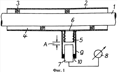 Вокруг сильфона 5 расположена труба 9, прочно и герметично соединенная с наружной трубой 2 и как металлическая труба предпочтительно сварена с ней. Труба 9 длиннее по оси, чем сильфон 5, при его наибольшей, показанной на фиг.1 длине. Она отделена от сильфона 5 кольцевым воздушным зазором, так что в осевом направлении он может свободно перемещаться в ней. Труба 9 имеет такую длину, что охватывает также, по меньшей мере частично, сенсорный выключатель 7. Сенсорный выключатель 7 уплотнен относительно трубы 9 уплотнительным элементом 10. Таким образом сильфон 5 и сенсорный выключатель 7 закрыты трубой от проникновения влаги и тем самым при определенных условиях защищены от атмосферных воздействий.