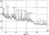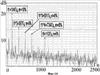 На фиг.11 приведен прямой высокочастотный спектр вибрации левого двигателя, измеренный в районе передней опоры компрессора и рядом расположенного центрального привода. В спектре идентифицированы дискретные составляющие “лопаточных” частот всех ступеней компрессора.