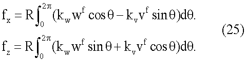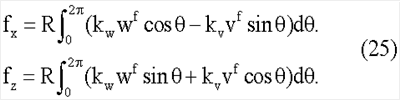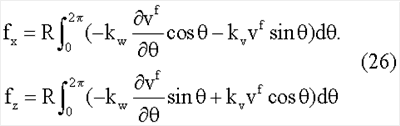 где: cw и cv – радиальное и тангенциальное демпфирование соответственно, qw и qv – внешние силы, действующие в радиальном и тангенциальном направлениях соответственно, p0 – давление накачки и b – ширина верхней части шины.