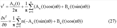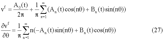 где: wi и vi – соответственно деформация кольца вдоль радиального и тангенциального направлений, n – единичный вектор в тангенциальном направлении. Следует отметить, что во вращающейся системе координат и в условиях отсутствия нагрузки система не является функцией времени. Это состояние обозначается как состояние без нагрузки или устойчивое состояние, или состояние свободного вращения.