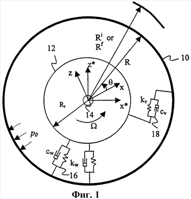 На Фиг.1 представлена модель шины 10 в виде упругого кольца, соединенного с крепежным приспособлением 12, таким как обод или жесткий диск. Центр колеса установлен на оси 14 вращения. Шина 10 соединена через распределенные радиальную 16 (или нормальную) и тангенциальную 18 пружины и демпферы с жестким круглым ободом 12. Упругое кольцо шины 10 вращается с номинальной скоростью вокруг центра 14 колеса. Для определения характеристик системы используют две координатные системы. Первая представляет собой фиксированную координатную систему (Ox*z*). Она представляет собой инерционную координатную систему, которая вообще не движется. Вторая координатная система обозначена Oxz, которая вращается вместе с кольцом со скоростью . Следующую терминологию используют для обозначения определенных параметров шины при вращении: w – смещение в радиальном направлении; v – тангенциальное смещение; p0 – давление накачки воздухом; R – радиус шины; wc – деформация под нагрузкой в пятне контакта в радиальном направлении; vc – деформация под нагрузкой в пятне контакта в тангенциальном направлении; A – площадь поперечного сечения шины; b – ширина шины; Ir – момент инерции обода и оси; kw – радиальная жесткость (исключая протектор); kv – тангенциальная жесткость (исключая протектор); cw – радиальное демпфирование (исключая протектор); cv – тангенциальное демпфирование (исключая протектор); kr – радиальная жесткость протектора; k – тангенциальная жесткость протектора; cr – радиальное демпфирование протектора; c – тангенциальное демпфирование протектора; EI – жесткость на изгиб верхнего блока; – скорость вращения шины; r – вращение обода по отношению к ; Rr – радиус обода; qw – внешняя сила в радиальном направлении; qv – внешняя сила в тангенциальном направлении.
