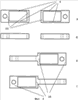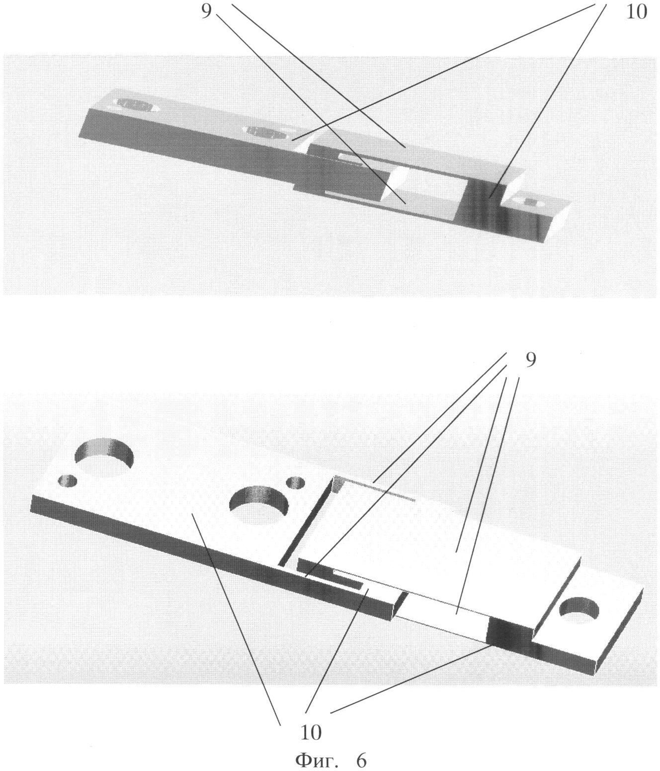 Пример 3. В частных случаях реализации устройства, описанные в примерах 1, снабжаются тензометрическими балками в виде моноблока, состоящего из двух пар плоскопараллельных пружин 9, соединенных с обоих концов между собой попарно перемычками 10 и повернутых относительно друг друга на 90° вдоль их оси, параллельной плоскости пружин, с соединением в единое целое по одной из перемычек 10, принадлежащей каждой из пар пружин 9 (см. фиг.4), или с использованием тензометрических балок в виде моноблока, состоящего из двух пар плоскопараллельных пружин 9, соединенных между собой попарно перемычками 10 с обоих концов и повернутых относительно друг друга на 90° вдоль их оси, параллельной плоскости пружин, с соединением в единое целое по внутренним сторонам перемычек (см. фиг.5 и 6).