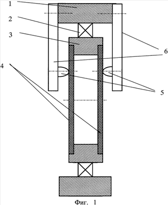 Пример 1. В самом общем случае устройство для испытания материалов на трение и износ содержит привод вращения в виде высокомоментного электродвигателя, статор которого 1 через подшипник 2 соединен с полым ротором 3 (см. фиг.1). В роторе 3 закреплены два идентичных испытываемых диска 4, которые взаимодействуют с испытываемыми инденторами 5, которые закреплены на тензометрических балках 6. Балки 6 закреплены на статоре 1 таким образом, что осуществляется упругое прижатие индентора 5 к боковой поверхности диска 4. На тензометрических балках известным образом наклеены тензодатчики (на чертеже не показаны), которые могут быть выбраны из числа известных. Тензодатчики соединены с регистрирующим прибором, который также выбирается из числа известных. В качестве высокомоментного двигателя может быть использован выпускаемый в Республике Беларусь двигатель серии RSM-P-24-122.