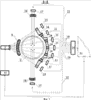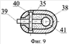 Инжектор 35 металлических частиц установлен внутри корпуса 1 в его диаметральном сечении перед второй вставкой 3 по направлению потока и предназначен для подачи в контролируемый поток частиц тяжелого металла. Инжектор 35 металлических частиц может содержать исполнительный механизм, соединенный с электроприводом и установленный внутри баллона, заполненного суспензией 38, содержащей тонкодисперсные частицы металлического порошка, например порошка платины, золота или свинца; в состав суспензии также могут входить нефть, вода и пластификатор, обеспечивающий консистентность суспензии во всем диапазоне рабочей температуры предложенного анализатора. Упомянутый баллон выполнен овальным в поперечном сечении и для уменьшения гидравлического сопротивления установлен в корпусе таким образом, чтобы большая ось овала совпадала с продольной осью корпуса. В стенке баллона выполнены прямоугольные отверстия. Исполнительный механизм инжектора 35 снабжен дисками, установленными таким образом, что часть каждого диска находится внутри баллона, а часть выступает сквозь упомянутое отверстие за его пределы. Поскольку исполнительный механизм должен размещаться внутри уплощенного баллона, все поворотные диски установлены в плоскости его продольного сечения, проходящей через большую ось овала (см. Фиг.8). Каждый из поворотных дисков 39 представляет собой червячное колесо, установленное на оси 40, находящееся в зацеплении с цилиндрическим червяком 41 (см. Фиг.9). Червяк 41 соединен с шаговым электроприводом 42, подключенным к генератору импульсов 43, вход которого соединен с дополнительным выходом вычислителя 29. Для герметизации червяка 41 предусмотрен сальник 44.