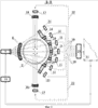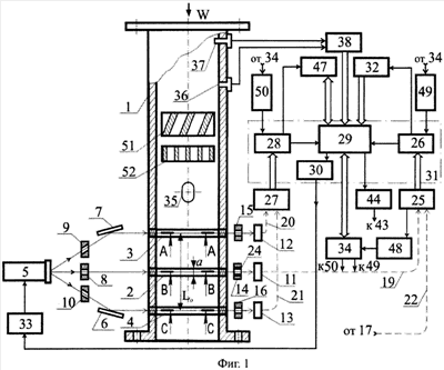 На чертежах введены следующие обозначения: 1 – корпус, 2, 3 и 4 – первая, вторая и третья рентгенопрозрачные вставки соответственно, 5 – рентгеновская трубка, 6 и 7 – первое и второе зеркала соответственно, 8, 9 и 10 – первый, второй и третий первичные коллиматоры соответственно, в каждом из которых выполнены коллимирующие отверстия, 11 – первый многоканальный детектор, 12 и 13 – вторые и третие сцинтилляционные детекторы соответственно, 14, 15 и 16 – первый, второй и третий вторичные коллиматоры соответственно, в каждом из которых выполнены коллимирующие отверстия, 17 – четвертые сцинтилляционные детекторы, 18 – ортогональные коллиматоры, 19, 20, 21 и 22 – первый, второй, третий и четвертый световоды соответственно, 23 – контрольные сцинтилляционные детекторы, 24 – вторичные излучатели, 25 – первый фотоэлектронный преобразователь, 26 – первый модуль обработки, 27 – второй фотоэлектронный преобразователь, 28 – второй модуль обработки, 29 – вычислитель, 30 – модуль управления, 31 – электронный блок, 32 – контроллер режимов, 33 – источник питания, 34 – внешние системы, 35 – инжектор металлических частиц, 36 – датчик давления, 37 – датчик температуры, 38 – измерительный преобразователь, 39 – суспензия, 40 – поворотный диск, 41 – ось поворотного диска, 42 – червяк, 43 – электропривод, 44 – генератор импульсов, 45 – сальник, 46 – уплотнительная прокладка, 47 – дискриминатор, 48 – контроллер трубки, 49 – первый таймер, 50 – второй таймер, 51 – струевыпрямитель, 52 – нормализатор.