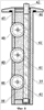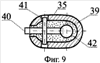 Инжектор 35 металлических частиц установлен внутри корпуса 1 в его диаметральном сечении перед второй вставкой 3 по направлению потока и предназначен для подачи в контролируемый поток частиц тяжелого металла. Инжектор 35 металлических частиц может содержать исполнительный механизм, соединенный с электроприводом и установленный внутри баллона, заполненного суспензией 39, содержащей тонкодисперсные частицы металлического порошка, например порошка платины, золота или свинца; в состав суспензии также могут входить нефть, вода и пластификатор, обеспечивающий консистентность суспензии во всем диапазоне рабочей температуры предложенного анализатора. Упомянутый баллон выполнен овальным в поперечном сечении и, для уменьшения гидравлического сопротивления, установлен в корпусе таким образом, чтобы большая ось овала совпадала с продольной осью корпуса. В стенке баллона выполнены прямоугольные отверстия. Исполнительный механизм инжектора 35 снабжен дисками, установленными таким образом, что часть каждого диска находится внутри баллона, а часть выступает сквозь упомянутое отверстие за его пределы. Поскольку исполнительный механизм должен размещаться внутри уплощенного баллона, все поворотные диски установлены в плоскости его продольного сечения, проходящей через большую ось овала (см. Фиг.8). Каждый из поворотных дисков 40 представляет собой червячное колесо, установленное на оси 41, находящееся в зацеплении с цилиндрическим червяком 42 (см. Фиг.9). Червяк 42 соединен с шаговым электроприводом 43, подключенным к генератору импульсов 44, вход которого соединен с дополнительным выходом вычислителя 29. Для герметизации червяка 42 предусмотрен сальник 45.