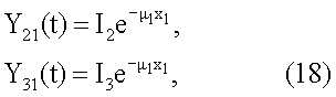 где Y21(t), Y31(t) – текущие значения плотности потока фотонов на входах вторых и третьих детекторов 12 и 13 соответственно при наличии в корпусе 1 однокомпонентной контролируемой среды;