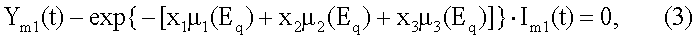 где Ym1(t) – текущее значение плотности потока фотонов на входе детектора с порядковым номером m первого многоканального детектора 11 при напряжении U1 питания рентгеновской трубки 5 и при наличии в корпусе 1 трехкомпонентной контролируемой среды;