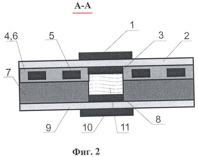 Порошок диоксида циркония, стабилизированный 8-9 мол.% оксидом магния с удельной поверхностью 7-8 м2/г и пикнометрической плотностью не менее 5,89 г/м3 смешивают с 60 мас.% поливинилбутираля, 32 мас.% трихлорэтилена, 5 мас.% деметилфталата, 2 мас.% синтамида. На майларовую пленку отливают керамическую пленку толщиной 350-600 мкм, сушат при 130°С. Из пленки вырезают заготовки размером 70·5 мм. В этих заготовках вырезают полость диаметром 0,6 мм. На заготовки методом трафаретной печати из пасты, состоящей из порошка соответствующего состава и раствора поливинилбутираля в терпинеоле с соотношением 1:10, последовательно наносят слои: