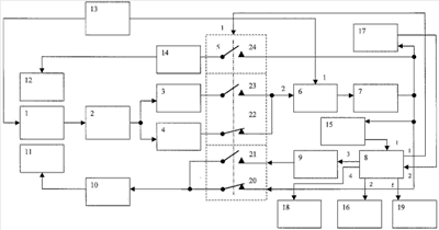 Изобретение поясняется чертежом, на котором изображена структурная схема устройства бесконтактного измерения тока катодной защиты. Устройство бесконтактного измерения тока катодной защиты содержит феррозонд 1 с первой 11 и второй 12 компенсационными обмотками, аналоговый преобразователь, включающий в себя измерительный усилитель 2, вход которого подключен к выходу феррозонда 1, а выход к первому избирательному усилителю 4, последовательно соединенные фазовый детектор 6 и фильтр низких частот 7, первый преобразователь напряжение – ток 10, выход которого подключен к первой компенсационной обмотке 11, аналого-цифровой преобразователь 15, цифровой выход которого соединен с первым входом контроллера 8, а аналоговый вход соединен с выходом фильтра низких частот 7, генератор возбуждения 13, выходы которого соединены со входом феррозонда 1 и первым входом фазового детектора 6 соответственно, в аналоговый преобразователь введены устройство вывода 16, устройство формирования временных интервалов 17, индикатор 18, клавиатура 19, вторые избирательный усилитель 3 и преобразователь напряжение – ток 14, цифроаналоговый преобразователь 9 и управляемый переключатель 5, первый вход которого соединен с первым выходом контроллера 8, второй выход которого соединен со входом устройства вывода 16, вход первого преобразователя напряжение – ток 10 соединен через первые нормально-замкнутый 20 и нормально-разомкнутые 21 контакты управляемого переключателя 5 с выходом фильтра низких частот 7 и выходом цифроаналогового преобразователя 9 соответственно, вход которого соединен с третьим выходом контроллера 8, четвертый и пятый выходы которого соединены соответственно со входами индикатора 18 и клавиатуры 19, а второй вход контроллера 8 соединен с выходом устройства формирования временных интервалов 17, вход которого соединен с выходом фильтра низких частот 7 и через третий нормально-разомкнутый контакт 24 управляемого переключателя 5 со входом второго преобразователя напряжение – ток 14, выход которого соединен со второй компенсационной обмоткой 12, второй вход фазового детектора 6 соединен через вторые нормально-замкнутый 22 и нормально-разомкнутые 23 контакты управляемого переключателя 5 с выходами первого 4 и второго 3 избирательных усилителей соответственно, вход последнего из которых соединен с выходом измерительного усилителя 2.