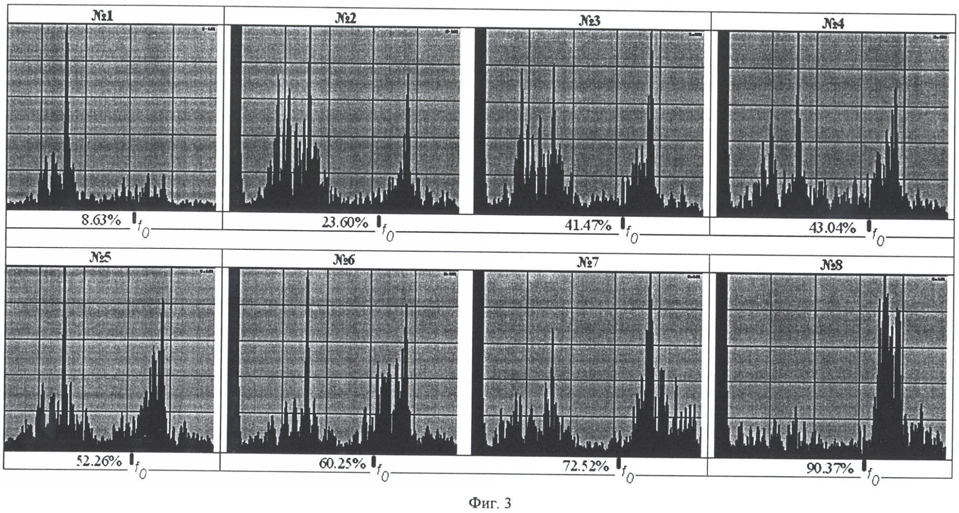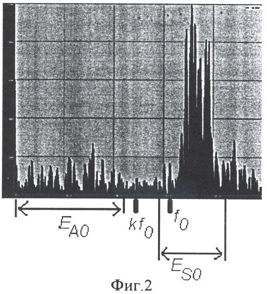 2.4. Определяются энергии сигнала в одном или двух частотных диапазонах: первый (обязательный) диапазон выше частоты k· 0, второй (необязательный) диапазон ниже частоты k· 0 (фиг.2). Отношения энергий в этих 2 диапазонах к полной энергии сигнала считают равными долям нулевой симметричной и нулевой антисимметричной волн в сигнале соответственно.
