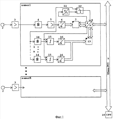2. Многоканальное акустико-эмиссионное устройство для контроля качества сварного шва в процессе сварки, состоящее из К каналов, каждый из которых состоит из последовательно соединенных акустического преобразователя, предварительного усилителя, фильтра, основного усилителя, аналого-цифрового преобразователя, выход которого цифровой шиной соединен с входом оперативного запоминающего устройства, выход которого двунаправленной шиной соединен с входом устройства управления, выход которого двунаправленной шиной соединен с шиной компьютера, которая, в свою очередь, соединена с центральным процессором, отличающееся тем, что в каждый канал дополнительно введены цифроаналоговый преобразователь, аналоговый компаратор, оперативное запоминающее устройство кода диапазонов, а также n узкополосных фильтров, n аналоговых интеграторов, n аналого-цифровых преобразователей сигналов частотных диапазонов, при этом выход основного усилителя соединен с неинвертирующим входом аналогового компаратора, инвертирующий вход которого соединен с выходом цифроаналогового преобразователя, вход которого соединен с первым выходом устройства управления каналом, а выход аналогового компаратора соединен с первым входом устройства управления каналом, второй выход которого соединен с первым входом оперативного запоминающего устройства кода диапазонов, третий выход устройства управления каналом двунаправленной шиной соединен с вторым входом оперативного запоминающего устройства кода диапазонов, а выход основного усилителя соединен с входами (1 n) параллельных цепей, состоящих из последовательно соединенных узкополосного фильтра, первым входом аналогового интегратора, аналого-цифрового преобразователя частотных диапазонов, выходы которых цифровой шиной соединены с третьим входом оперативного запоминающего устройства кода диапазонов, а четвертый выход устройства управления каналом соединен со вторым входом аналогового интегратора.