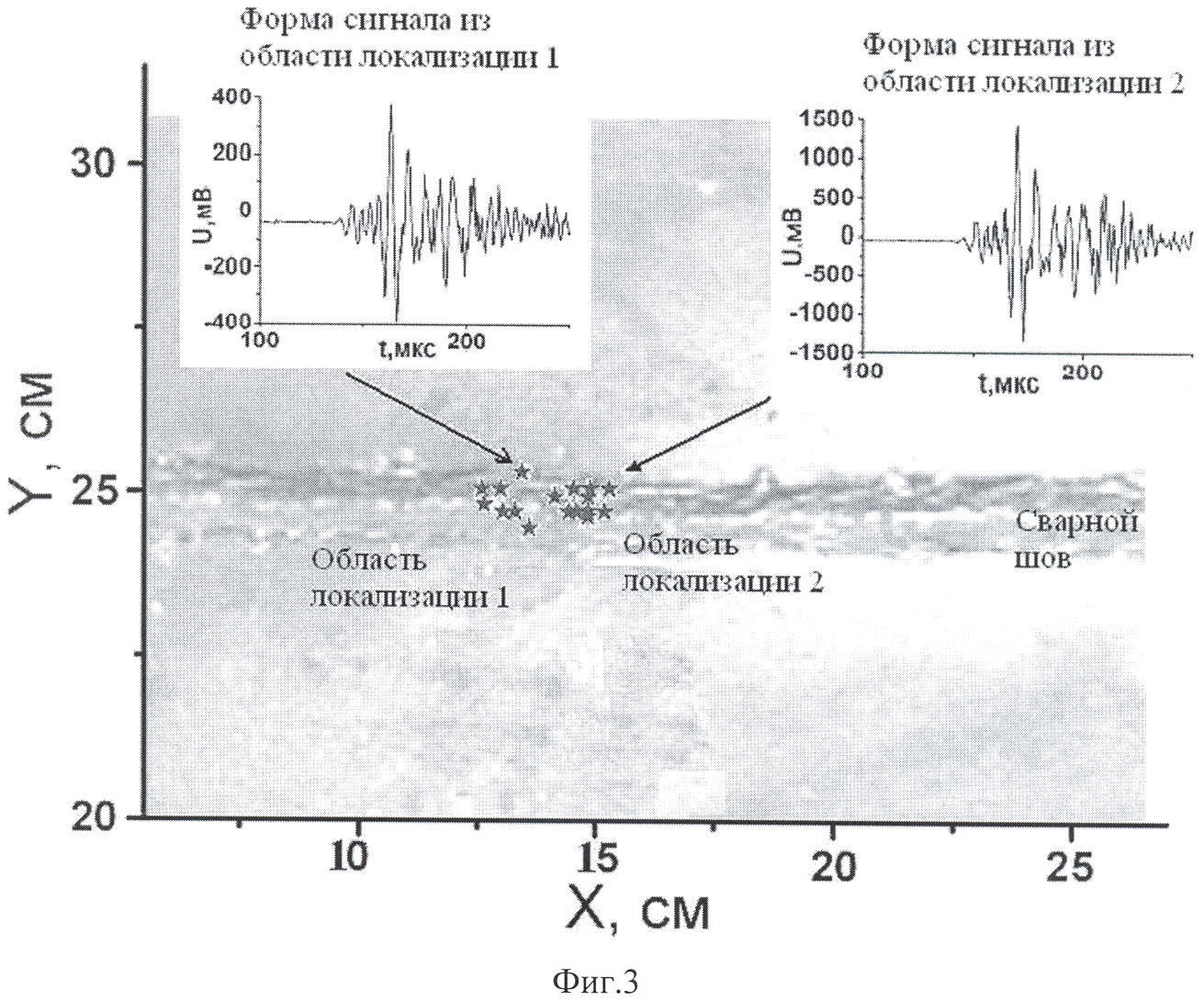 Использование: для акустико-эмиссионного контроля качества сварного шва в процессе сварки. Сущность: заключается в том, что осуществляют прием возникающих в зоне сварки акустических сигналов смещенными друг относительно друга и относительно сварного шва К широкополосными акустическими преобразователями, усиление принимаемых акустических сигналов, их фильтрацию по величине заданной пиковой амплитуды и степени высокочастотности спектра акустического сигнала, аналого-цифровое преобразование, регистрацию времен прихода сигналов акустической эмиссии на акустические преобразователи, вычисление координат источников акустических сигналов, по результатам акустико-эмиссионного контроля строят картину локализации сигналов акустической эмиссии и выделяют активные области, характеризующиеся повышенным количеством сигналов акустической эмиссии, при этом в процессе контроля регистрируют непрерывные сигналы, усредняют их амплитуду на заданном интервале времени и по ее значению регулируют порог селекции канала преобразования информации для приема в зоне сварки акустических сигналов и по цифровой форме сигнала акустической эмиссии проводят кластеризацию группы сигналов для каждый пьезоантенны, состоящей из трех акустических преобразователей, выделяют группы сигналов, объединенных в кластеры, проводят их локализацию, и при превышении в кластерах критического числа сигналов, удовлетворяющих условиям превышения амплитудной и частотной селекции, сварной шов бракуется. Технический результат: повышение достоверности контроля дефектов и точности их локализации в сварном шве во время сварки и остывания сварного шва. 2 н.п. ф-лы, 3 ил.