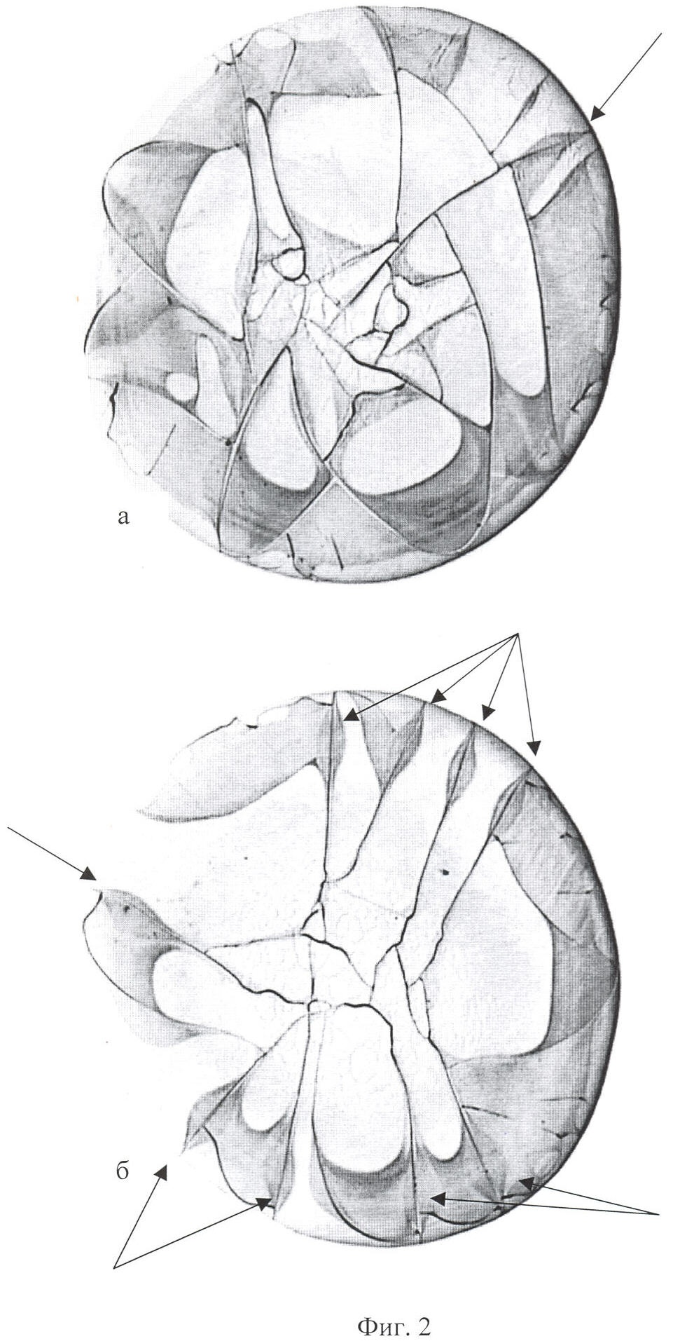 Пациентка О., 58 лет, проведен адьювантный курс лучевой терапии по поводу олигодендроглиомы головного мозга. При исследовании сыворотки крови до облучения также установлена единственная структура в форме листа (фиг.2,а). После завершения лучевой терапии (СОД-45 Гр) выявлено девятикратное увеличение подобных структур в образцах капли сыворотки (фиг.2,б).
