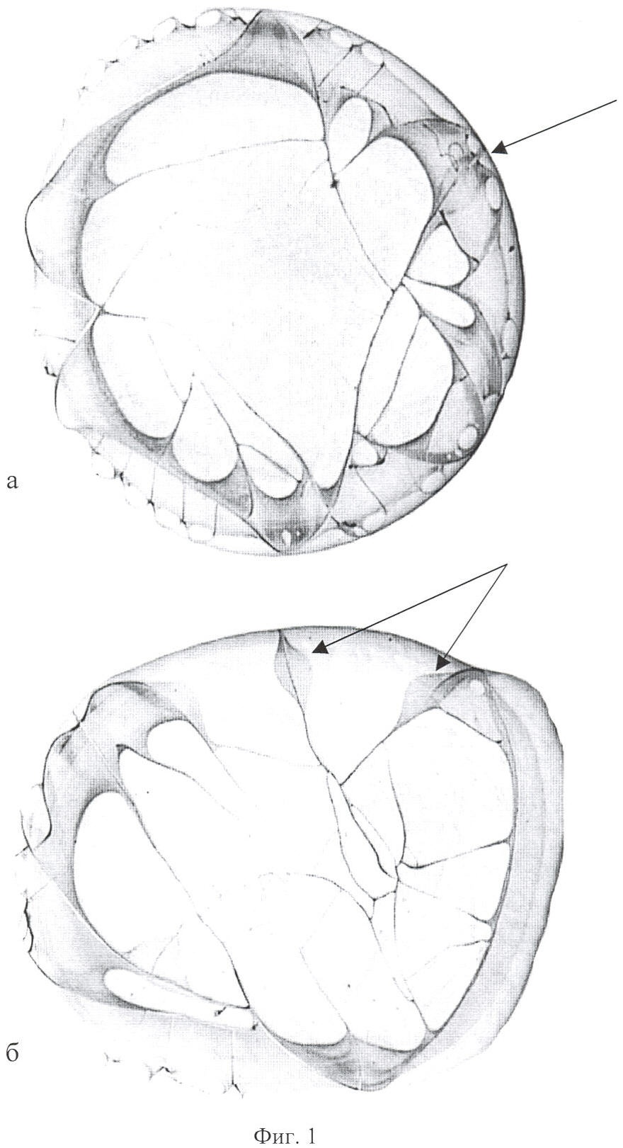 При исследовании по предложенной методике: до начала лучевой терапии в капле сыворотки крови (фиг.1,а) установлена только одна структура в форме листа. Пациентке проведен курс лучевой терапии до 55 Гр, после чего выполнен повторный забор сыворотки крови, в котором обнаружены уже 2 структуры в форме листа (фиг.1,б). На момент завершения облучения состояние пациентки несколько улучшилось. Полученные данные позволили сделать вывод о том, что в данном клиническом наблюдении повреждения сосудистой стенки в ходе выполнения лучевой терапии все же имеют место, но они носят незначительный характер и не приводят к существенному нарушению проницаемости гематоэнцефалического барьера, а следовательно, и к нарастанию отека головного мозга.