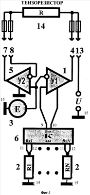 Вывод тензорезисторе 14, подключенный к выходу операционного усилителя 5, находится под потенциалом источника 3, т.к. связан проводом, на котором нет падения напряжения, с одним из входов, находящихся под потенциалом источника 3 операционных усилителей 1 и 5.