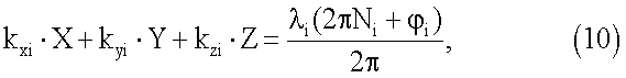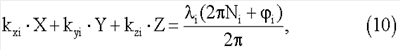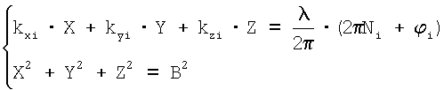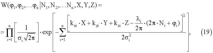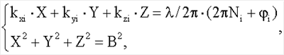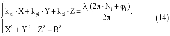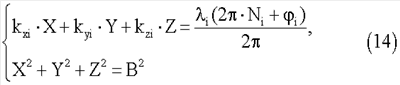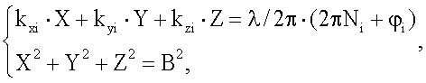 i – длина волны сигнала i-го космического аппарата, Ni – значение целочисленной неоднозначности сигнала i-го космического аппарата, удовлетворяющее условию |Ni| int(В/ +0,5), В – расстояние между антеннами при n 2 – известное с высокой точностью, при n>2 – подлежащее уточнению в процессе решения системы уравнений, X, Y, Z – неизвестные значения относительных координат фазового центра второй антенны относительно первой.