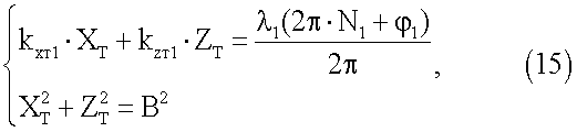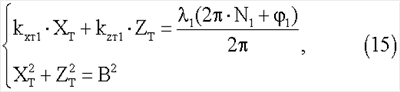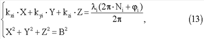 Решение системы (13) может осуществляться в два этапа: вначале определяют неизвестные значения X, Y, Z из линейных уравнений, а затем, используя нелинейное уравнение, определяют неизвестное расстояние между антеннами В.