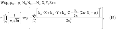 3. После решения системы уравнений для n КА и нахождения уточненных значений неизвестных происходит определение значения функции правдоподобия для полученных значений направляющих косинусов. Функция правдоподобия для нормального распределения погрешностей измерения ФС определяется выражением: