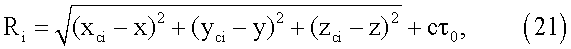 Система уравнений (21) содержит 4 неизвестных и для ее однозначного решения необходимо принять сигналы не менее 4-х КА. Способы решения таких систем рассмотрены, например, в [5, с.230-231].