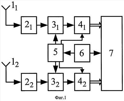 Сигналы n космических аппаратов принимаются двумя разнесенными антеннами 11 и 12, усиливаются малошумящими усилителями 11 и 22, преобразуются в сигналы промежуточной частоты и усиливаются радиотрактами 31 и 32 и затем поступают в блоки цифровой обработки сигналов 41 и 42, где происходит разделение сигналов каждого из космических аппаратов. Блоки цифровой обработки сигналов 41 и 42 реализованы по схеме оптимального корреляционного приемника, на выходе которого формируются отсчеты корреляционных интегралов I и Q для сигналов каждого из КА, которые соответствуют результатам корреляционного перемножения принимаемых сигналов на синфазную и ортогональную составляющие опорного сигнала, выдаваемого формирователем опорных сигналов 5 для каждого из космических аппаратов. На вычислительный блок 7 возложены функции управления режимами работы приемника, включающими в себя поиск, захват сигналов по частоте и задержке, частотную и фазовую автоподстройку, синхронизацию по метке времени и границе бита служебной информации, прием и декодирование служебной информации, измерение радионавигационных параметров сигнала. К радионавигационным параметрам сигнала относятся его задержка, частота и фаза. Кроме управления режимами работы и измерения радионавигационных параметров вычислительный блок 7 решает задачи вторичной обработки измеренных параметров, заключающиеся в определении координат КА на момент проведения измерений (задача размножения эфемерид) на основе принятой служебной информации, вычисления координат места объекта и определения угловой ориентации антенной платформы. Также на вычислительный блок 7 возложена задача прогноза сеансов навигационных определений и управления режимами работы блоков 41 и 42 для КА, появляющихся или покидающих зону радиовидимости.