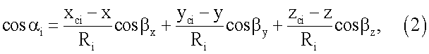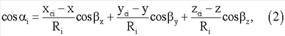 – расстояния между объектом и i-м КА, полученные на основе известных координат КА и объекта, cos x, cos y, cos z – неизвестные направляющие косинусы вектора-базы объекта.