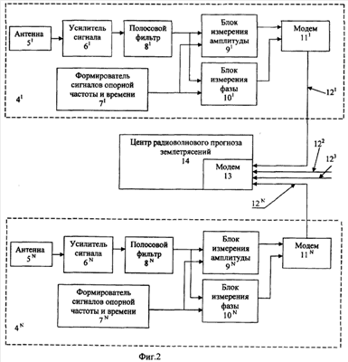 На фиг.2 показана структурная схема системы. Система состоит из N (N как минимум равно 2) приемных устройств 4 и центра радиоволнового прогноза землетрясений 14 с модемом 13. Каждое приемное устройство 4 состоит из приемной антенны 5, соединенной со входом усилителя сигнала 6, выход которого соединен со входом полосового фильтра 8, выход которого соединен с первыми входами блока измерения амплитуды 9 и блока измерения фазы 10. На вторые входы блоков 9 и 10 поступают сигналы с выхода формирователя сигналов опорной частоты и времени 7. С выходов блока измерения амплитуды 9 и блока измерения фазы 10 сигналы поступают на вход модема 11. Выход модема 11 через канал связи 12 соединен с одним из входов модема 13 центра радиоволнового прогноза землетрясений 14, который и принимает решение о зонах предполагаемого землетрясения.