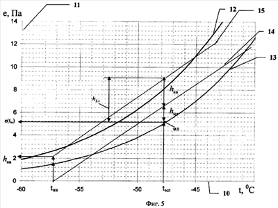 12, 13 – две кривые изменения парциального давления насыщенного пара над водой Eв(t) и надо льдом Eл(t) в зависимости от температуры смешанной струи;