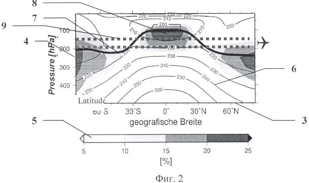 Известен способ прогнозирования метеорологических условий, благоприятных для образования устойчивых кондследов, переходящих затем в перистую облачность, описание которого изложено в следующих работах: «Aviation and climate change: option for mitigation», DLR, Institute of Atmospheric Physics, Germany, автор U.Schumann, 2006; «Contrails, contrail-cirrus, and ship tracks», Atmosphere and Climate Conference, Oxford, June 2006, автор K.Gierens; «Minimizing contrail formation due to flight route optimization», AERONET Workshop, November 20/21, 2006, автор A.Waibel; «Impact of Cruise Altitude on Contrails», AAC Conference, June 2003, Friedrichshafen, Germany, авторы С.Fichter и др. и работа тех же авторов «The impact of cruise altitude on contrails and related radiative forcing» в журнале Meteorologische Zeitschritt, v. 14, 2005, 4. Он заключается в следующем. На основе модели глобальной циркуляции атмосферы «GSM», разработанной Метеорологическим институтом Макса Планка (Report 218, The atmospheric general circulation model. Max Planck Institute for Meteorology, 1996, Hamburg, Germany), вычисляют атмосферные зоны, в которых существуют благоприятные условия для образования устойчивых кондследов (повышенная влажность при низкой температуре), обобщают по географическим зонам, сезонам, высотам, составляют карты, пример которых показан на фиг.2, 3, 4, накладывают требуемые трассы полетов на эти карты, сопоставляют эти трассы с зонами образования кондследов и делают заключение о вероятности образования устойчивых кондследов и соответственно о возможности перехода их в перистые облака по пути следования самолета по рассматриваемому маршруту.