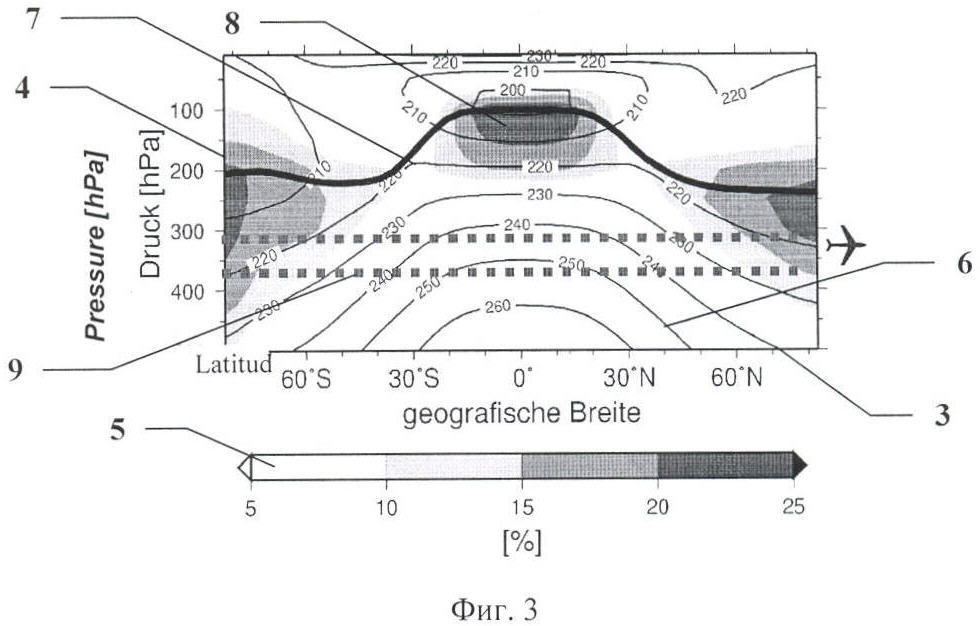 На фиг.3 представлена диаграмма повторяемости встречи атмосферных зон интенсивного образования кондследов при полете на пониженных высотах, относительно типовых высот (см. фиг.2), где