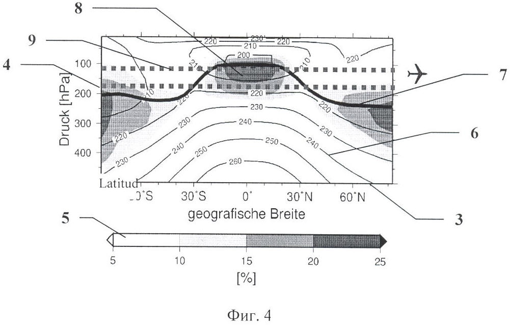 На фиг.4 представлена диаграмма повторяемости встречи атмосферных зон интенсивного образования кондследов при полете на повышенных высотах, относительно типовых высот (см. фиг.2), где