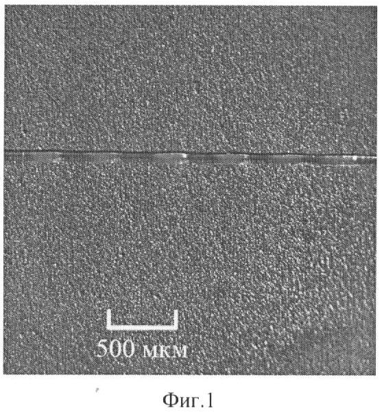 Волокно из кварцевого стекла диаметром 200 мкм вертикально погружают в 10% раствор нитроцеллюлозы в этилацетате, затем вертикально извлекают волокно из раствора. Процедуру повторяют 3 раза, после чего волокно высушивают при комнатной температуре в течение 3-4 часов. На фиг.1 показан участок волокна с гофром, сформировавшимся из высыхающих капель полимера. Видно, что период гофра составляет 1 мм, модуляция толщины гофра 20 мкм.