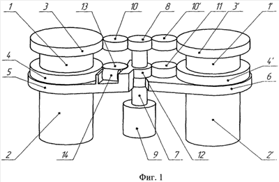 Панкратическая система включает также корпус, который состоит из двух (левой 5 и правой 6) половинок, шарнирно закрепленных на центральной оси 7. Каждая пара трубок (1, 2 и 1 , 2 ) смонтирована с возможностью вращения на одной из половинок корпуса. Панкратическая система имеет центральное зубчатое колесо 8, закрепленное на корпусе с возможностью вращения и соединенное с узлом 9 его привода во вращение, два основных промежуточных колеса 10 и 10 одинакового диаметра и с одинаковым числом зубьев, которые объединяют упомянутое центральное зубчатое колесо 8 с зубчатыми колесами 3 и 3′ левой и правой основных (внутренних) трубок 1 и 1 . Каждое упомянутое промежуточное зубчатое колесо закреплено на одной из половинок корпуса.