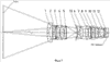 Как показано на фиг.1, компоненты объектива расположены последовательно на оптической оси, причем компоненты 1-5 расположены до апертурной диафрагмы 13, компоненты 5 и 6 разделены большим воздушным промежутком, за компонентом 6 расположены компоненты 7-12. Компоненты 1 и 2 представляют собой отрицательные мениски, обращенные вогнутыми поверхностями к пространству изображений. Компонент 3 выполнен в виде отрицательного мениска, обращенного выпуклой стороной к пространству изображений, компонент 4 – в виде положительной двояковыпуклой линзы, компонент 5 – в виде положительного мениска, обращенного вогнутой стороной к пространству изображений, компонент 6 – отрицательный и склеен из двух линз – отрицательной двояковогнутой и положительной двояковыпуклой, компонент 7 – в виде положительной двояковыпуклой линзы, компонент 8 – в виде положительной линзы, обращенной вогнутой стороной к пространству изображений, компонент 9 – в виде отрицательной двояковогнутой линзы, компонент 11 – в виде двух склеенных линз – отрицательного мениска, вогнутой поверхностью обращенного к пространству изображений, и положительной двояковыпуклой линзы, компонент 12 – в виде отрицательной плосковогнутой линзы, обращенной плоской стороной к пространству изображений. На фиг.2 представлены характеристики качества изображения заявляемого объектива в виде графиков зависимости коэффициента передачи контраста (вертикальная ось) от пространственной частоты (горизонтальная ось) для нескольких полей зрения (0 мм, 100 мм, 150 мм, 200 мм, 250 мм и 312 мм). Каждое поле зрения на графике характеризуется двумя кривыми, соответствующими меридиональному и сагиттальному сечению светового пучка.