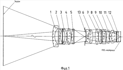 Объектив работает следующим образом. Световой поток от экрана последовательно проходит все компоненты до апертурной диафрагмы 13, которая вырезает из всего потока полезную часть, соответствующую относительному отверстию, проходит все компоненты после апертурной диафрагмы 13 и образует изображение в плоскости изображений объектива, в которой устанавливается приемник, например ПЗС-матрица.