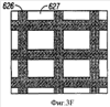 В примере активной оптической компенсационной структуры, показанной на фиг.3Е, устройство 624 использует дополнительное освещение в форме решетки фронтального освещения. В этом случае органический светоизлучающий материал 626, например структуры алк-диамин (Alg/diamine) и поли(фенилен-винилен), может наноситься и структурироваться на подложке. На виде сверху, показанном на фиг.3F, показан шаблон 627, который соответствует решетке интерферометрического модулятора, расположенной ниже. То есть светоизлучающие области 626 спроектированы для затенения неактивных участков между интерферометрическим модулятором и оставления открытой апертуры на остальных участках. Свет активным образом излучается в подложку на интерферометрический модулятор и затем отражается обратно к наблюдателю. И наоборот, структурированная излучающая пленка может быть нанесена на заднюю пластину дисплея, и свет пропускается вперед через промежутки между субпикселями. Путем структурирования зеркала спереди дисплея этот свет может отражаться назад на решетку интерферометрических модуляторов. Установленный на периферии источник света во взаимосвязи с пленками, основанными на полном внутреннем отражении, характеризует собой еще один подход. Патент US 6055090 также раскрывает интерферометрический модулятор, имеющий активную оптическую компенсационную структуру, которая включает в себя дополнительный источник фронтального освещения.