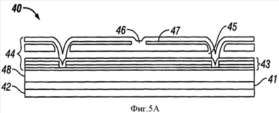 Фиг.5А иллюстрирует вариант осуществления пространственного модулятора 40 света, в котором пассивная оптическая компенсационная структура (рассеиватель 41) расположена между подложкой 42 и светомодулирующим элементом 44, вместо расположения на противоположной стороне подложки относительно светомодулирующего элемента, как показано на фиг.4. В варианте осуществления, показанном на фиг.5А, светомодулирующий элемент 44 является интерферометрическим модулятором, содержащим полость 45, подвижную стенку 46, оптический пакет 43 и опору 47. Оптический пакет 43 находится на стенке полости 45, которая противоположна подвижной стенке 46. В показанном варианте осуществления пространственный модулятор 40 света также содержит выравнивающий слой 48 между подложкой 42 и оптическим пакетом 43. Как подвижная стенка 46, так и оптический пакет 43 являются отражающими, так что действие пространственного модулятора 40 света в основном сходно с тем, которое описано для пространственного модулятора 10 света, проиллюстрированного на фиг.4. В типовом случае подложка 42 является, по меньшей мере, частично прозрачной. Специалистам в данной области техники должно быть понятно, что светомодулирующий элемент 44 может быть выполнен в виде решетки, содержащей множество индивидуально адресуемых светомодулирующих элементов, размещенных на прозрачной подложке и выполненных с возможностью модуляции света, прошедшего через прозрачную подложку.