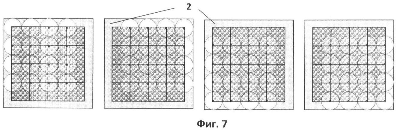 Для наглядности на Фиг.7 показаны четыре последовательных состояния экрана (из s2 подобных состояний), в которых зафиксированы сдвинутые ракурсы на внутренней матрице (2). Каждому из изображенных состояний соответствует один кадр телевизионного изображения, причем для обеспечения непрерывности изображения необходимо обеспечить частоту таких кадров не менее 25 кадров в секунду. Внутренняя матрица может сканироваться стандартным образом, формируя видеосигнал, который записывается или передается для воспроизведения. Для обеспечения синхронизации видеосигнал может содержать управляющие импульсы, необходимые для управления внешней матрицей.