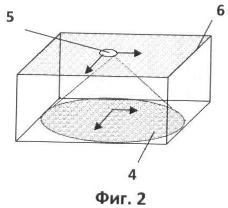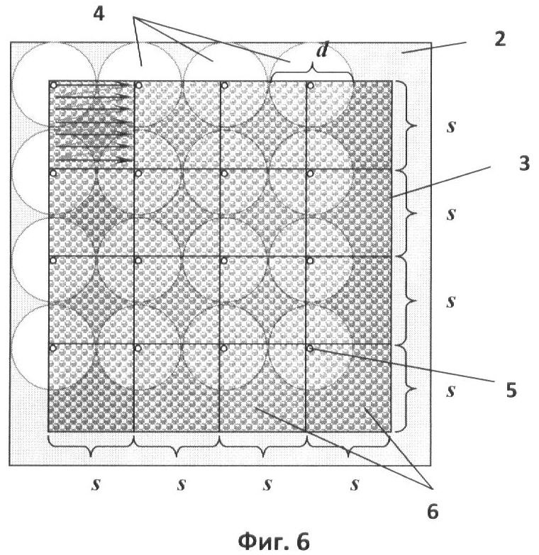 В сдвоенной матрице можно условно выделить элементы, которые в один момент времени формируют полное изображение объекта – это своего рода миниатюрные фотокамеры. Одной такой мини-камере соответствуют: участок внешней матрицы (3), центральная ячейка (4) которой «открыта» для пропускания света и кадр внутренней матрицы (5), состоящий из прямоугольного массива (6) пикселей, фиксирующих изображение (см. Фиг.2). Стрелками на чертеже показано направление обхода при преобразовании изображения в цифровой вид.