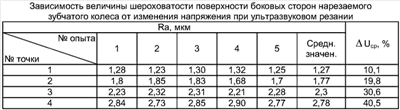 Производили определение шероховатости боковой поверхности зубьев нарезаемого зубчатого колеса z=60 с наложением ультразвуковых колебаний амплитуды 4-6 мкм на заготовку из стали 40Х червячно-модульной фрезой из Р6М5 с т=0,8 мм на различных режимах резания. Изменения напряжения пьезоэлектрического преобразователя при механической обработке регистрировалось и оценивалось по формуле: