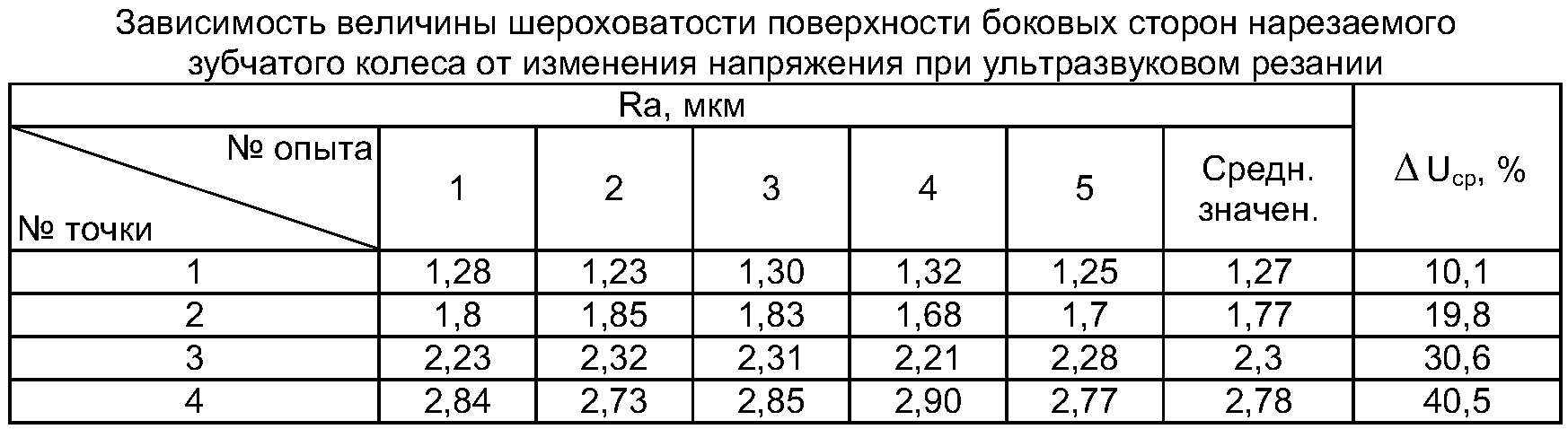 Изменение напряжения при ультразвуковом резании измеряется высокочастотным вольтметром ультразвукового генератора, результаты экспериментов по определению зависимости величины шероховатости поверхности боковых сторон нарезаемого зубчатого колеса приведены в таблице, а эта же графическая зависимость – на фиг.3