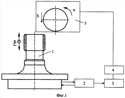 Введение электронного блока 3 обеспечивает возможность контроля шероховатости поверхности в режиме реального времени и поддержание предельно допустимых технологических режимов, а введение ЭВМ 4 – расчет коррекции режимов резания и реализацию решений по изменению режимов резания в системе металлорежущего станка с ЧПУ 5, обеспечивает оперативное управление параметрами шероховатости поверхности заготовки через изменение режимов резания.