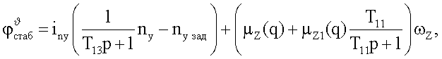 T13, T11 – постоянные времени фильтров, – оператор Лапласа, i ,i ,iH,iny – постоянные коэффициенты пропорциональности, µz(q), µz1(q) – коэффициенты пропорциональности, изменяющиеся в зависимости от скоростного напора q, H=Н-Hз.