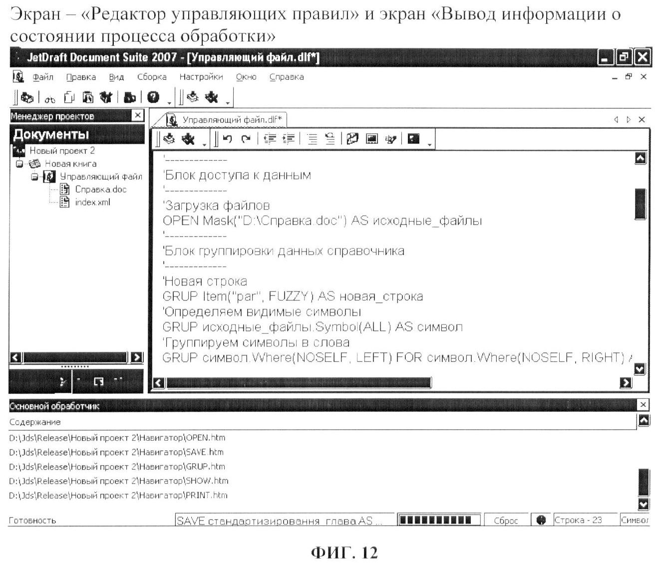 фиг.12 – вариант выполнения пользовательского интерфейса «Редактор управляющих правил» и «Вывод информации о состоянии процесса обработки»;