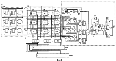 Аналогично работа схемы продолжается до тех пор, пока в счетчике 26 не установится код числа m. Это вызывает сигнал переполнения на выходе переполнения счетчика 26. Соответствующий единичный сигнал поступает на второй разрешающий вход дешифратора 15, который разрешает его работу, а также на вход одновибратора 32, который генерирует одиночный единичный импульс, подающийся с двух выходов с запаздыванием. Запаздывание импульса, поступающего со второго (нижнего) выхода, должно обеспечить время, достаточное для того, чтобы обеспечить импульсу с первого (верхнего) выхода пройти цепь элементов: элемент ИЛИ 31, счетчик 27, элемент ИЛИ 28, дешифратор 15, счетчик 20.i (i=1, 2, , m). Таким образом импульс с первого выхода одновибратора 32 подается на первый вход элемента 31 ИЛИ и на вход сброса счетчика 27, сбрасывая его в начальное единичное состояние. Импульс с выхода элемента 31 ИЛИ поступает на счетный вход счетчика 27, где по переднему фронту увеличивает его содержимое на единицу до кода k (k=1, 2, , m). Значение кода k через элемент ИЛИ 28 поступает на вход дешифратора 15. Тогда на k-м выходе дешифратора 15 возбуждается единичный импульс, который поступает на соответствующий счетчик 20.k и увеличивает его содержимое по заднему фронту на единицу.